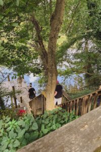 Those who were sure-footed took steep stairs down to the river, walking past a riverbank full of native hydrangeas.  One could just imagine sipping a cup of morning coffee on the dock, as the river ran past and the pollinators hummed and the birds sang – grateful for the land being brought back to life.