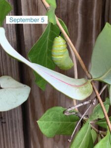 We continued to check on it for the next few days and on the afternoon of September 4th. we found it hanging in its “J” shape from another part of the coral honeysuckle. We learned this “J” is the “pre-pupa” stage and happens just before a cat forms a chrysalis and begins its metamorphosis into an adult monarch.