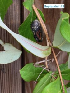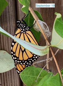And then on September 19th we had a beautiful boy emerge or “eclose” from its chrysalis! The male markings (pheromone pouches) on the hind wings are unfortunately not visible in this photo but they were there when we looked. We didn’t want to be too intrusive to take more